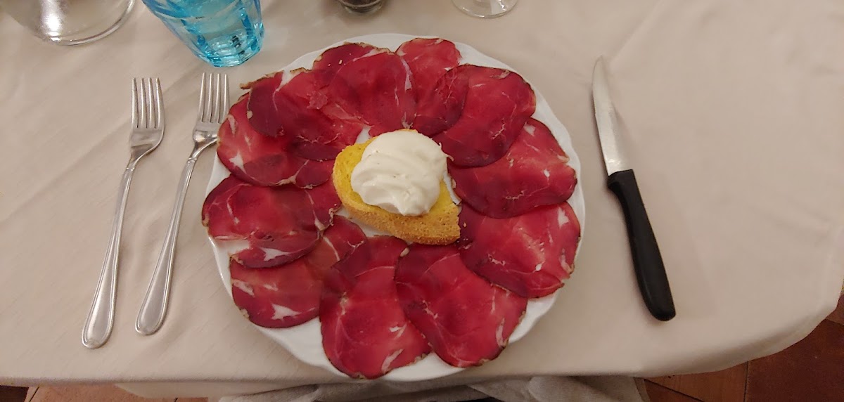 We had an outstanding dinner here. For our primi piatti we had Tagliolini con zucchine e petto d’oca (Tagliolini with zucchini and goose breast) - delicious. For our secondi we chose Maialino de latte al forno (Suckling pig), which is one of our favourite dishes. This version was cooked to perfection - highly recommend. Dolci was a superb soufflé di pistacchio as well as a generous serving of gelato al fior di latte. All this for €50 for two people (*no wine this evening, just two litres of sparkling water. Great value for an outstanding dinner- highly recommend.